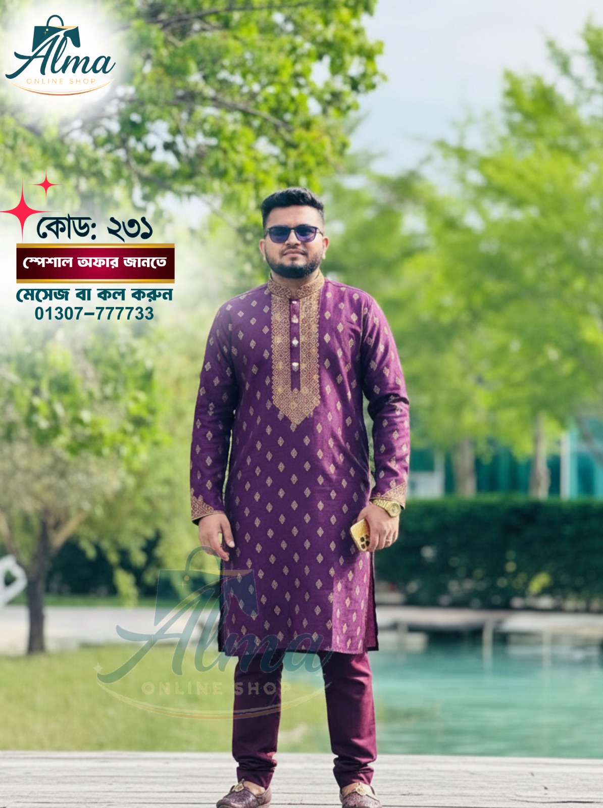 কোড ও কালার: পার্পেল-২৩১, সী-গ্রীন-২৩৩ পাঞ্জাবীর সাইজ ও মূল্য: ৩৮ থেকে ৫৪ সাইজ ১২৮০ টাকা, ১৬ থেকে ৩৬ সাইজ ৮৮০ টাকা থ্রি-পিসের